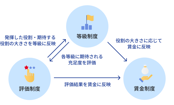 例えば、人材に対する評価によって等級や賃金が決まっていくほか、等級によって評価の項目や基準、あるいは賃金が変化するなど、それぞれの制度は相互に深い関係を持っています。