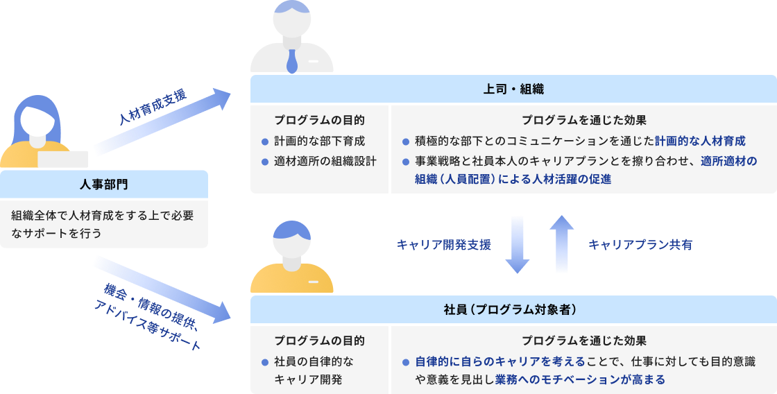 社員の多様化が進む中、部下一ひとりと真摯に向き合い、その強みを活かす働きかけをしていくことがラインマネジャーには求められています。キャリアマネジメントプログラムでは、社員の意思によるキャリアプランの具体化を各部門のマネジャーが促すことで、部門での計画的な人財育成等を図ります。
